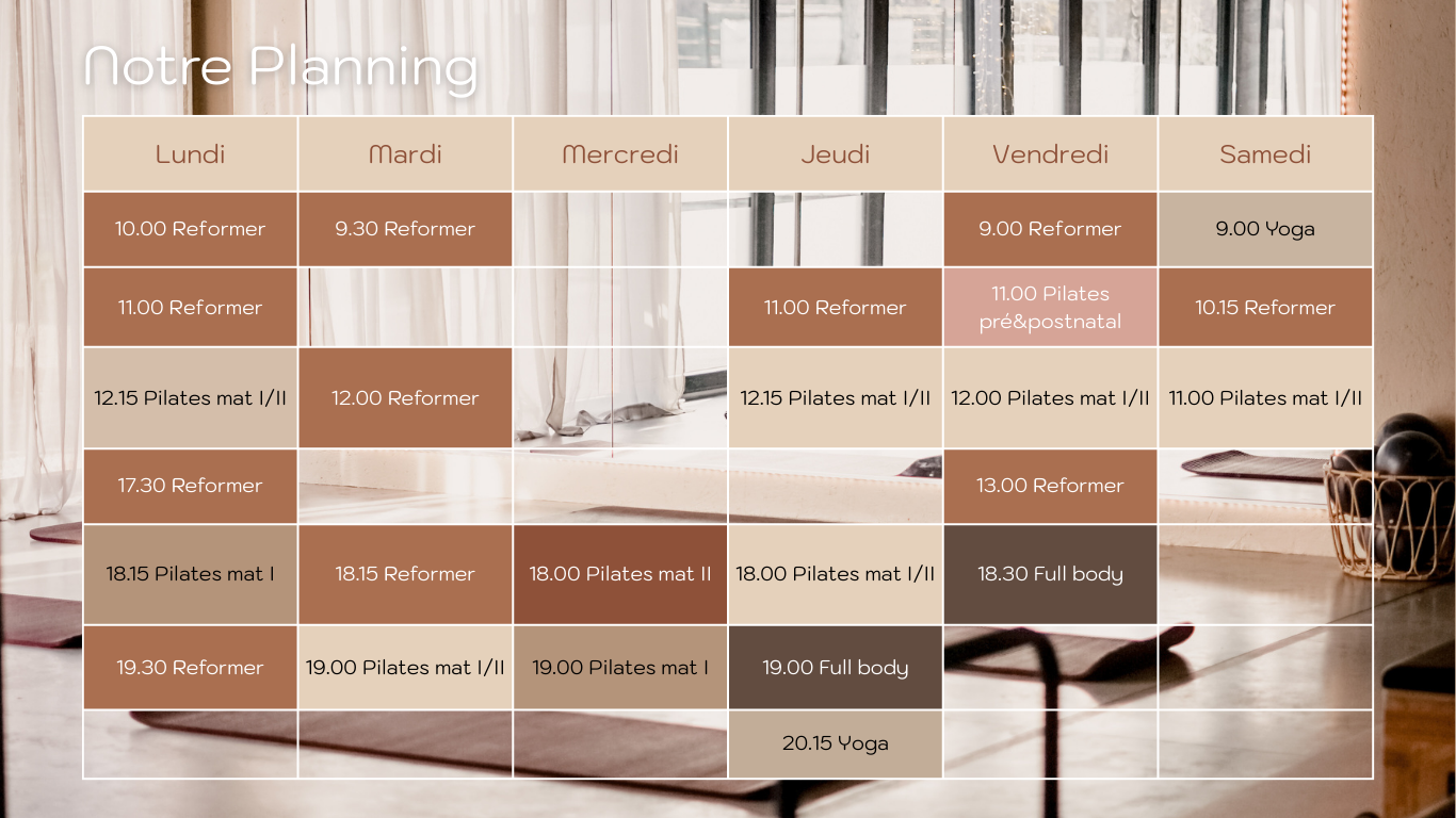 Un seul cours d'essai possible sur tapis (Pilates OU Full body) et un seul cours d'essai possible sur Reformer.